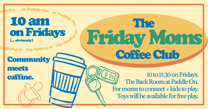Caffeinated connection time for moms. Bring your preschoolers or babies, or come kid free if your kids are in school. Toys or TV will be available for kids.